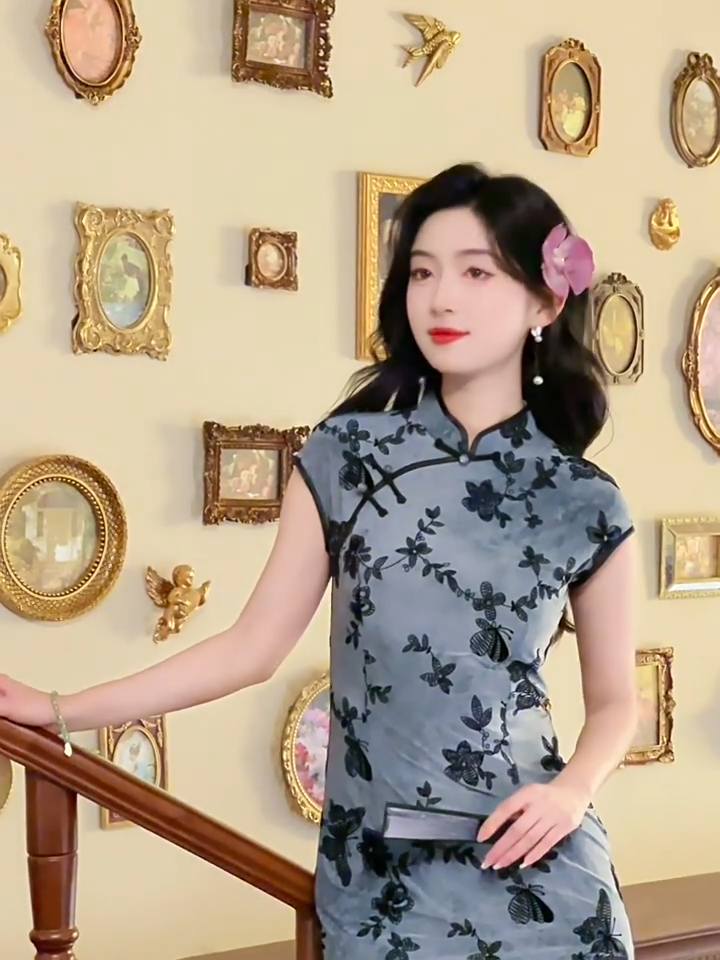 Design Feature: Vintage Floral Pattern, High Waist, with a slit up the side, mandarin collar